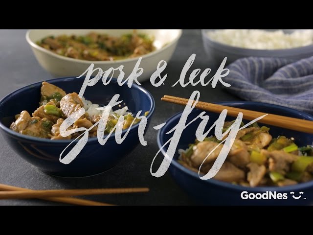 Heat remaining 1 ½ teaspoons peanut oil in same wok; swirl to coat. Add leeks; stir-fry for about 3 minutes or until almost tender. Add garlic and ginger; stir-fry for about 30 seconds or until fragrant. Add pork back to wok.